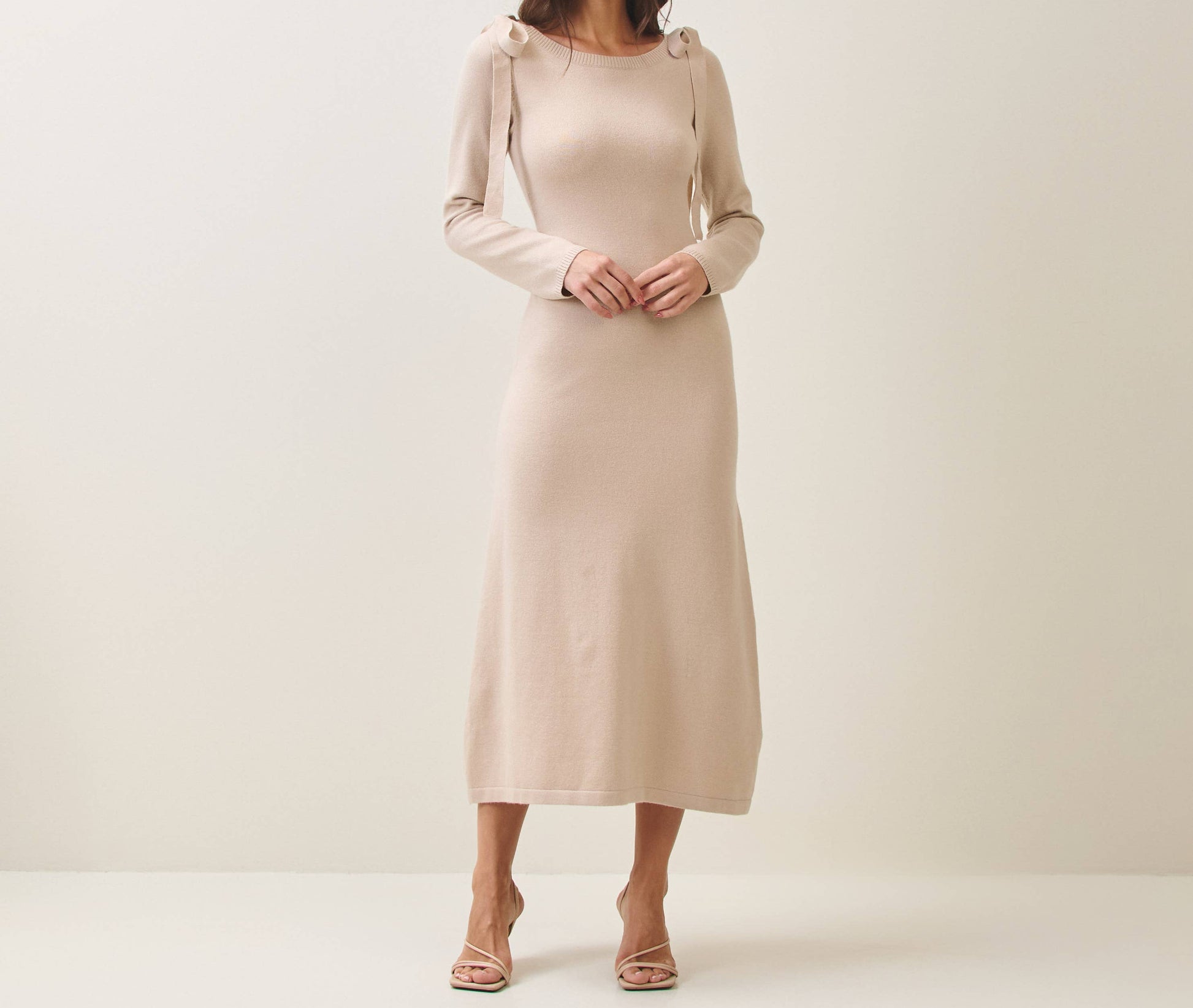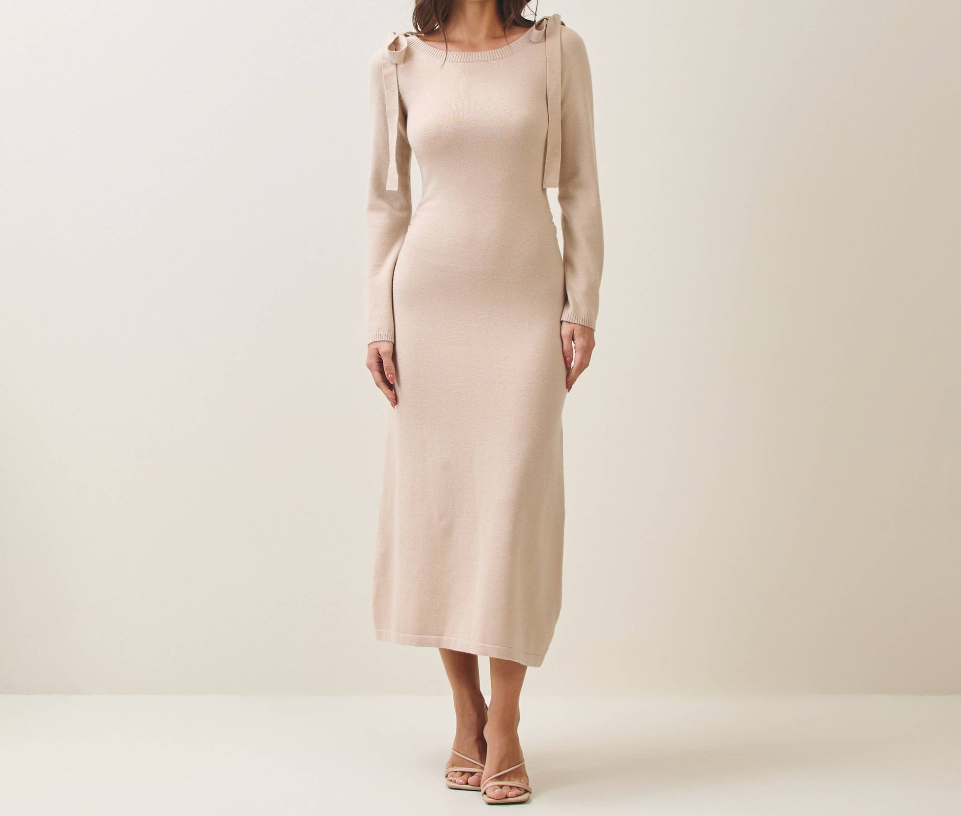 Bow shoulder knit dress - Long sleeves - Tie details - Ribbed hem - Maxi dress Model measurements: 5'8" tall Model is wearing a US size Small